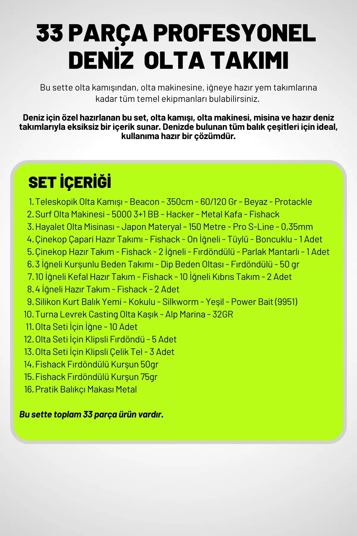 nDeniz odaklı hazırlanmış bu olta seti, kıyı balıkçılığına başlamak isteyen kullanıcılar ve güçlü bir ekipman seti arayan deneyimli kullanıcılar için kapsamlı bir çözümdür. Surf kamış, güçlü olta makinesi, misina, hazır takımlar, çapari, kaşık ve çeşitli aksesuarlarla deniz kıyısında ihtiyaç duyulan temel ekipmanları tek pakette sunar.n