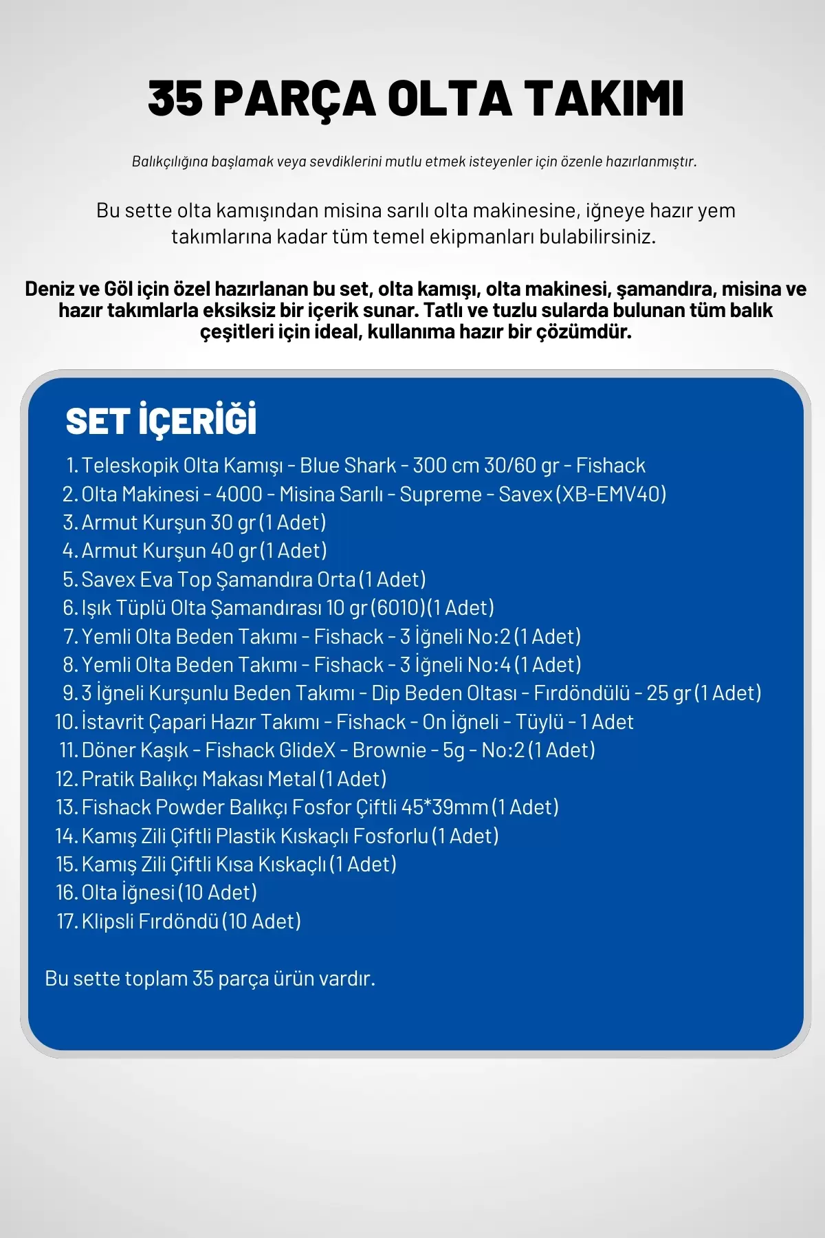 - Toplam 35 parça profesyonel olta seti; kamıştan makineye, iğneden klipsli fırdöndüye kadar tam donanımlı bir çözüm sunar.