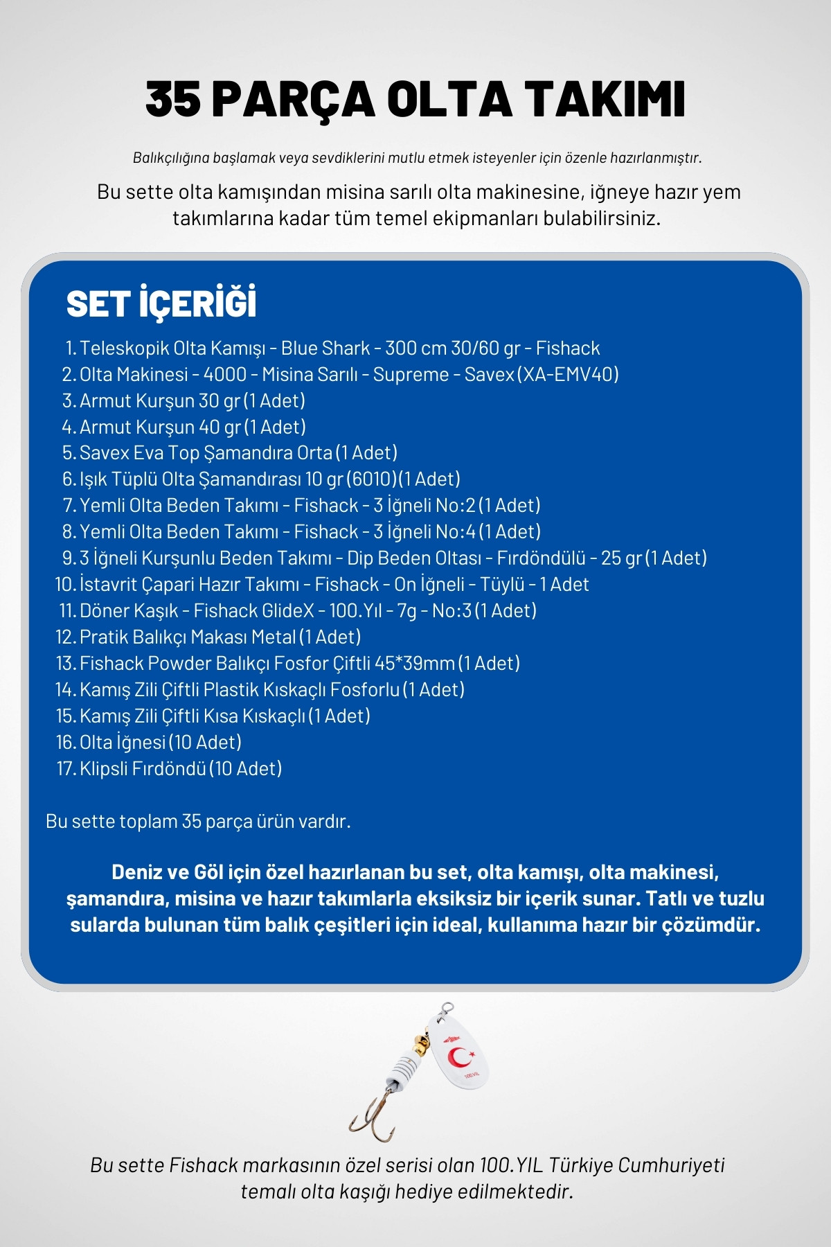 - Toplam 35 parça profesyonel olta seti; kamıştan makineye, iğneden klipsli fırdöndüye kadar tam donanımlı bir çözüm sunar.