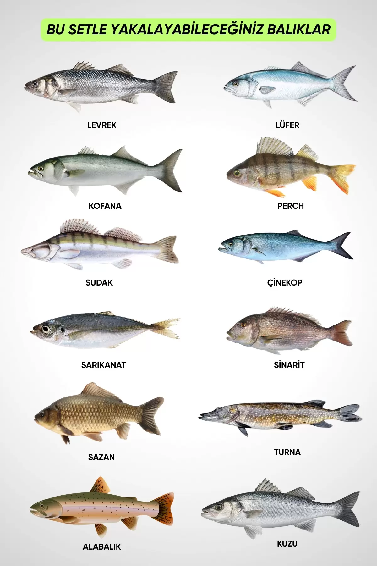 Set içeriğinde yer alan dip takımları, çapari, döner kaşık ve şamandıralı sistemler sayesinde hem tatlı hem tuzlu suda farklı türler hedeflenebilir. Kullanım tekniğine ve su bölgesine göre aşağıdaki balık türleri yakalanabilir: