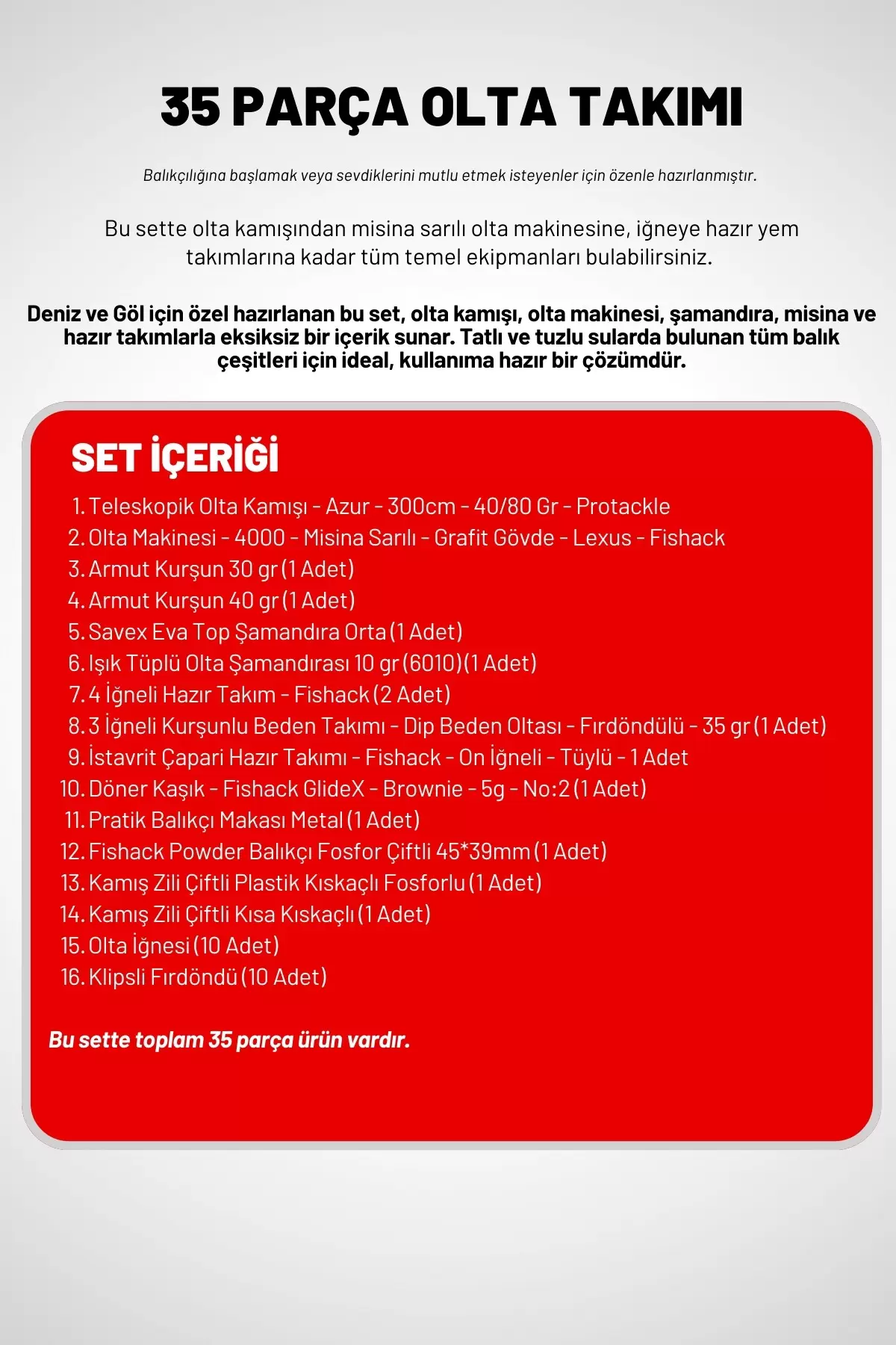 Eğer balıkçılığa yeni başlıyor veya tüm temel ekipmanları tek pakette edinmek istiyorsanız, bu 35 parçalık set dengeli ve hazır bir çözümdür. Kullanım alanınıza göre takımı doğru kurmanız önemlidir. Fishack üzerinden set içeriğini inceleyerek ihtiyaçlarınıza uygunluğunu güvenle değerlendirebilirsiniz.