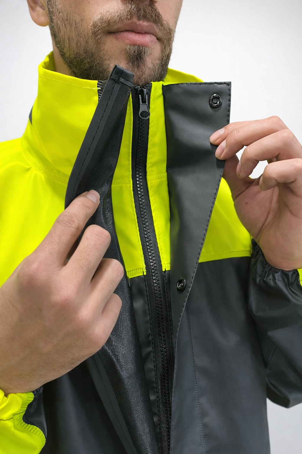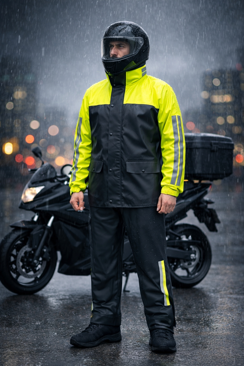 Koruyucu fermuar yapısı suyun kritik noktalardan içeri girmesini engellerken, reflektör detayları düşük görüş koşullarında fark edilmenizi artırır. Bu özellik, gece sürüşleri ve yoğun trafikte güvenlik açısından önemli bir avantaj sağlar. Takım formu üst ve alt parça ile bütüncül koruma sunar; rüzgarın ve yağışın vücutla temasını minimuma indirir.