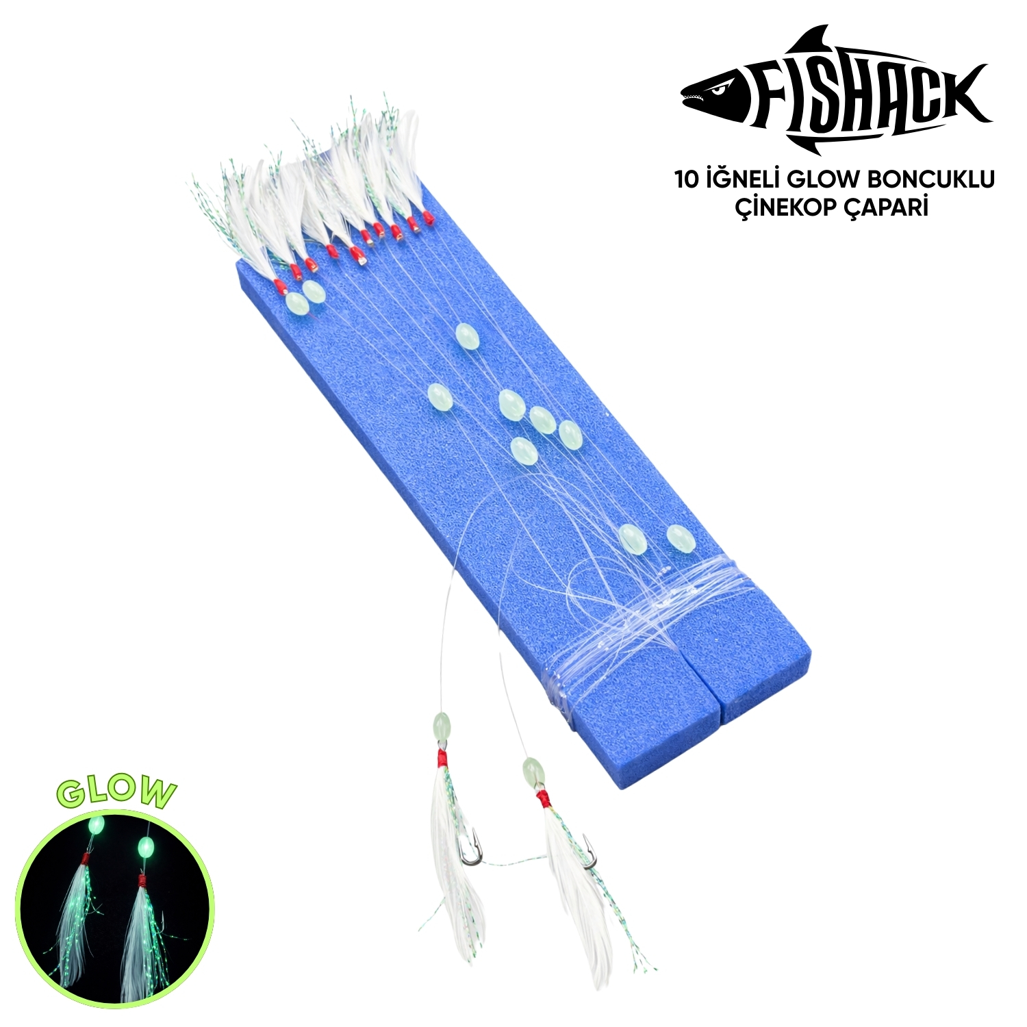 Çinekop Çapari Hazır Takımı - Fishack - On İğneli - Tüylü - Glow Boncuklu, özellikle pelajik türlerin avcılığı için tasarlanmış çok fonksiyonlu hazır çapari takımıdır. Sürü halinde gezen çinekop, istavrit, uskumru ve palamut gibi balıklar için ideal performans gösterir. Takım, dalışa hazır şekilde sunulur ve ek bağlama işlemi gerektirmez.