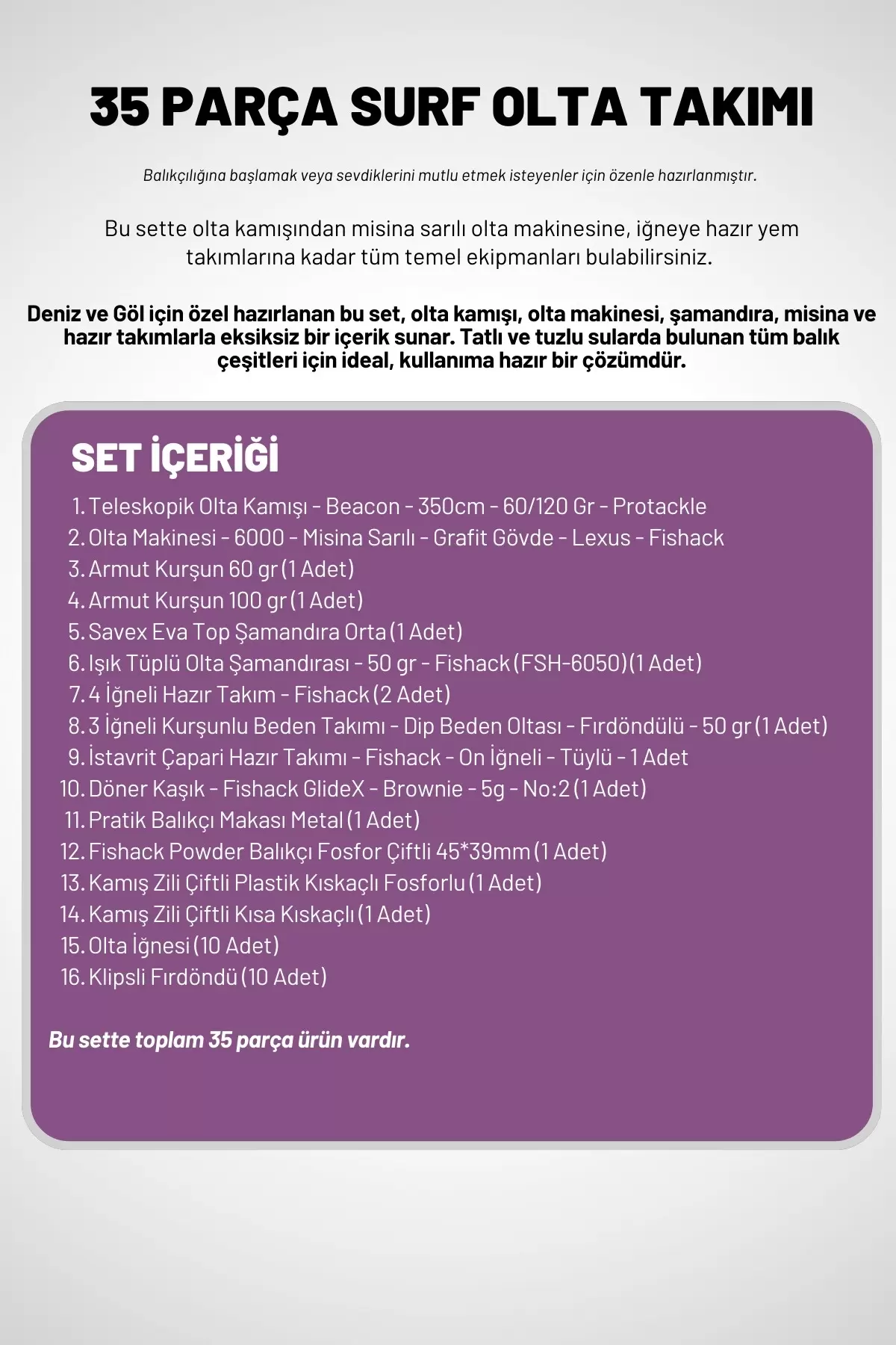 Deniz ve Göl 35 Parça Surf Olta Takımı, uzun mesafe atış gerektiren kıyı kullanımları için hazırlanmış güçlü ve dengeli bir settir. 350 cm surf kamış ve 6000 boy misina sarılı makine kombinasyonu sayesinde hem deniz kıyısında hem geniş göl alanlarında stabil kullanım sağlar. Yüksek gramaj kurşun seçenekleri ve hazır takımlar ile kapsamlı bir içerik sunar.