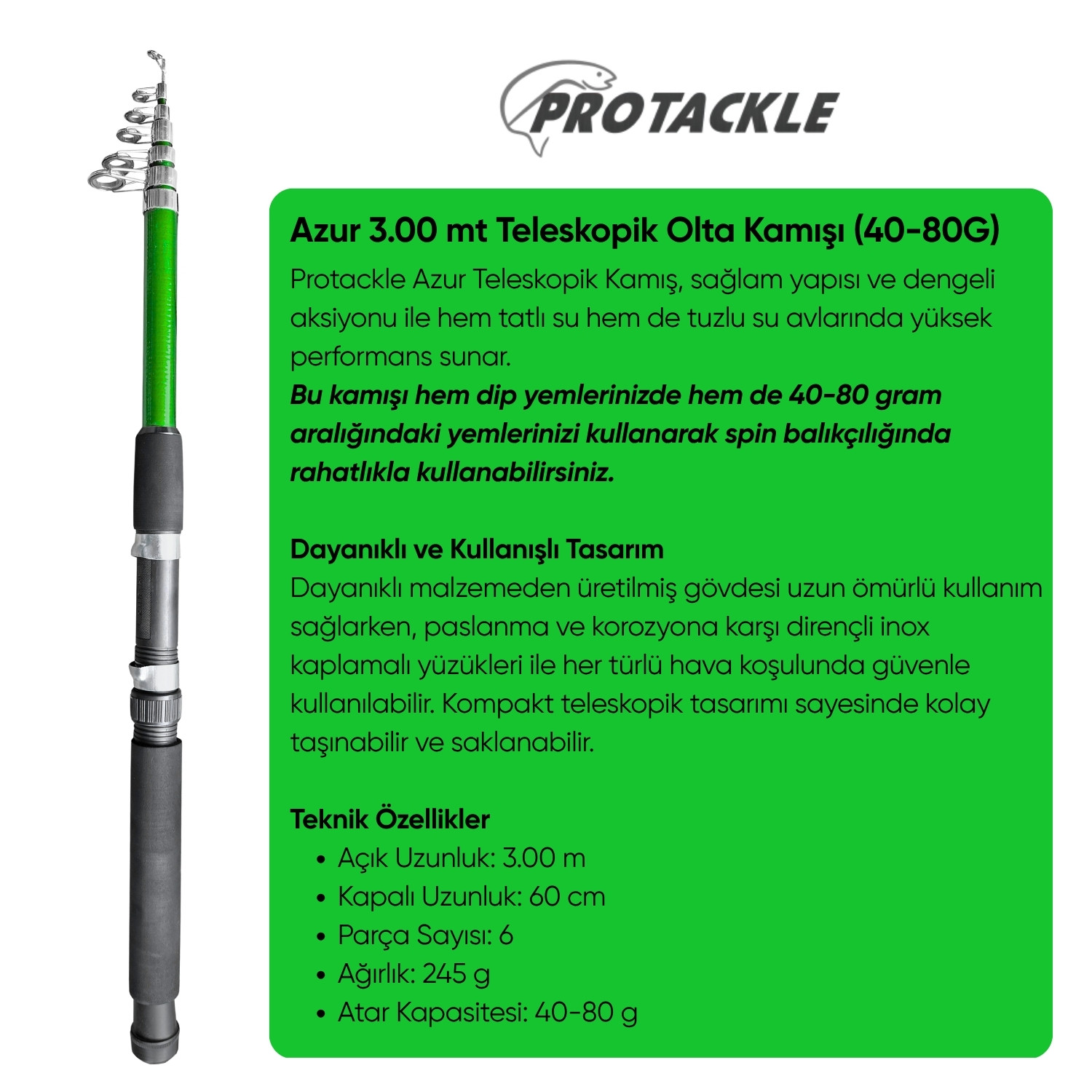 • Kamış: Protackle Azur Teleskopik Olta Kamışı – 3.00 m (40-80 g)