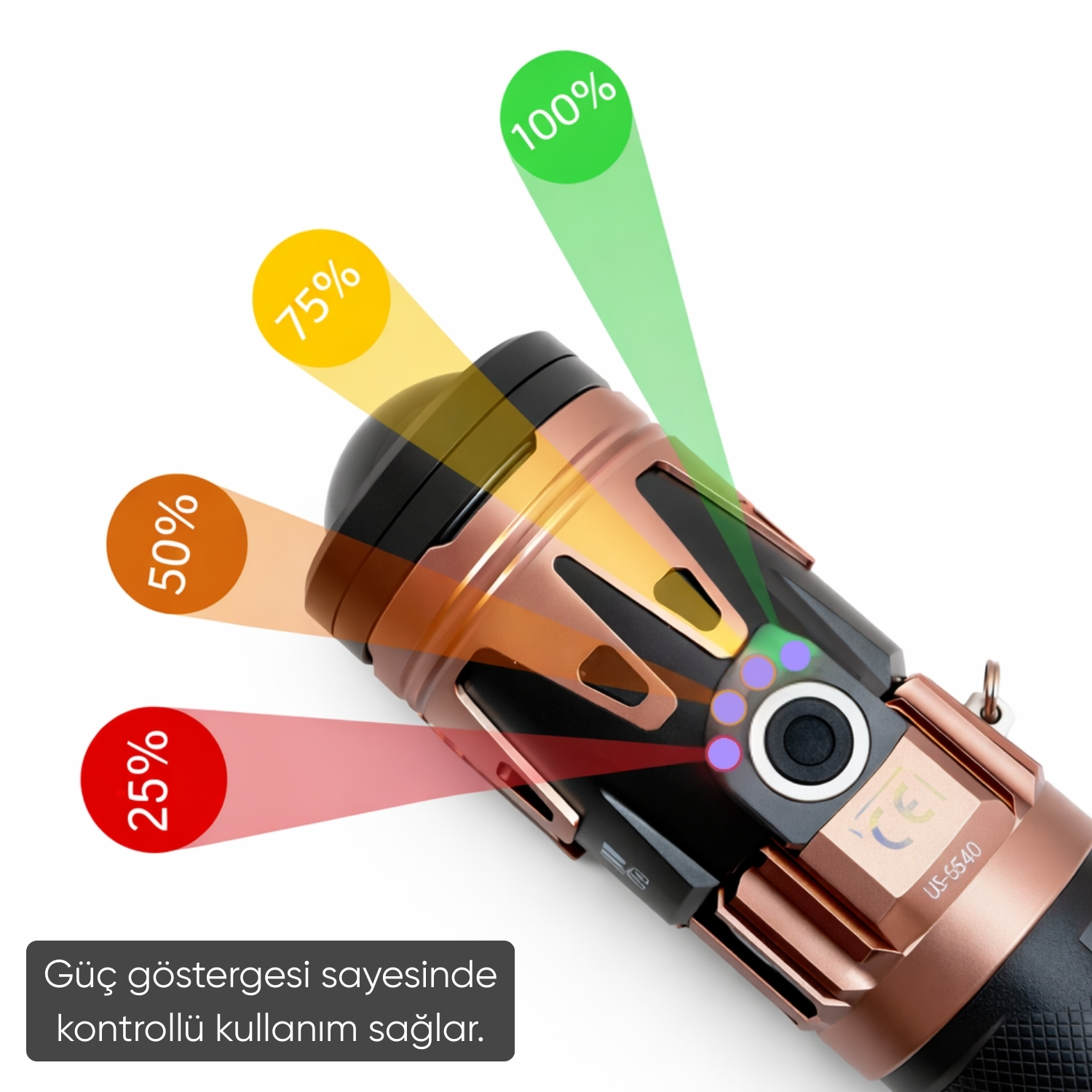 19200 mAh kapasiteli dahili bataryası, yaklaşık 8 saat kesintisiz çalışma süresi sunar. USB-A ve Type-C şarj girişleri sayesinde farklı adaptör ve güç kaynaklarıyla kolayca şarj edilebilir. Şarj göstergesi, kalan batarya seviyesini kontrol etmenizi sağlar. Zoom özelliği ile ışık demeti daraltılarak uzak noktalara odaklanabilir veya geniş açıya alınarak alan aydınlatması yapılabilir.