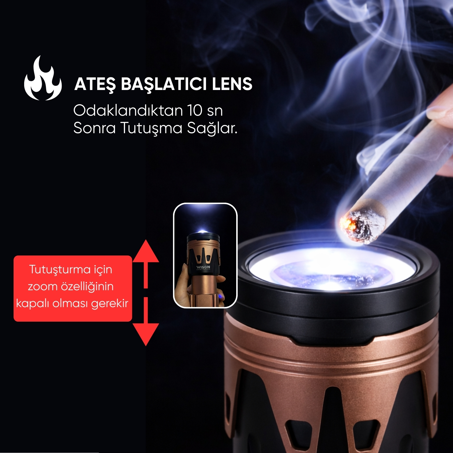 İlave ateş yakma merceği, doğru odaklama ile kontrollü tutuşturma amacıyla kullanılabilir. Tutuşturma için zoom özelliğinin kapalı olması gerekir ve odaklandıktan yaklaşık 10 saniye sonra tutuşma gerçekleşir. Ürün; kampçılar, doğa severler, güvenlik personelleri ve güçlü ışık ihtiyacı olan kullanıcılar için uygundur. Kompakt ve hafif cep feneri arayanlar için ağır kalabilir.