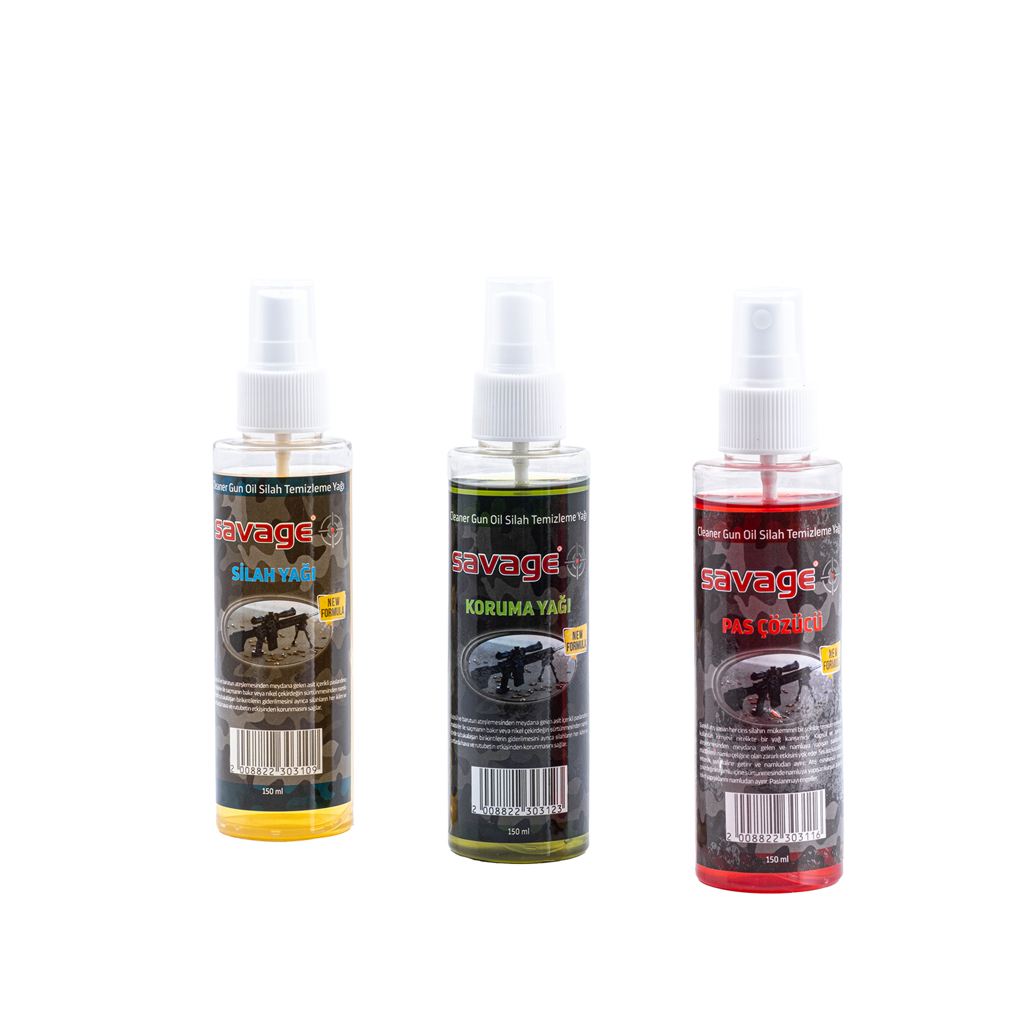 Savage Üçlü Silah Bakım Seti, silahların uzun ömürlü ve yüksek performanslı olabilmesi için gerekli olan bakım ve koruma işlemlerini eksiksiz bir şekilde sağlar. Bu set, Savage Silah Yağı, Savage Pas Sökücü ve Savage Koruma Yağı olmak üzere üç farklı üründen oluşur. Her biri 150 cc olan bu sprey yağlar, silahınızın her türlü bakımını kolayca yapmanızı ve her iklim koşulunda mükemmel performans almanızı sağlar.