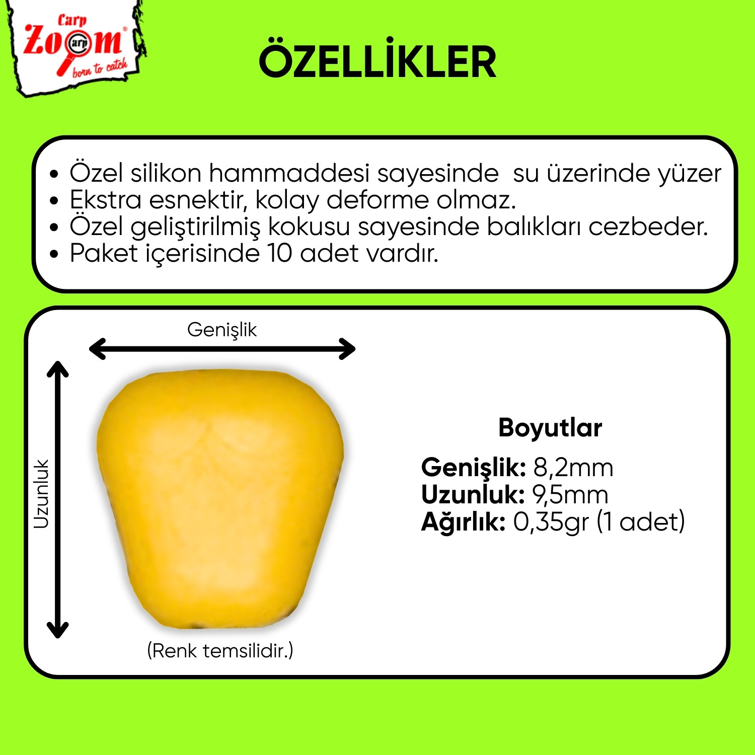 Fiyat–performans açısından avantajlı bu silikon mısır yem, sazan avlarında yüksek verim sağlar. Su üzerinde yüzen yapısı ve özel kokusu sayesinde balıkları hızlıca cezbetmeye yardımcı olur.